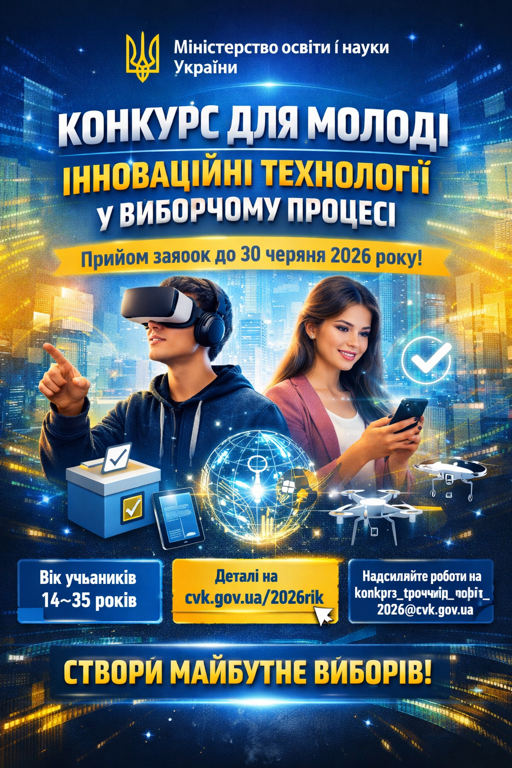 Міністерство освіти і науки України інформує про проведення конкурсу серед молоді на виборчу тематику «Інноваційні технології у виборчому процесі», який триватиме до 30 вересня 2026 року. Хто може брати участь До участі запрошуються громадяни України віком від 14 до 35 років. Умови конкурсу Детальні умови проведення розміщено на офіційному вебсайті Центральної виборчої комісії: https://www.cvk.gov.ua/2026rik.html Як […]