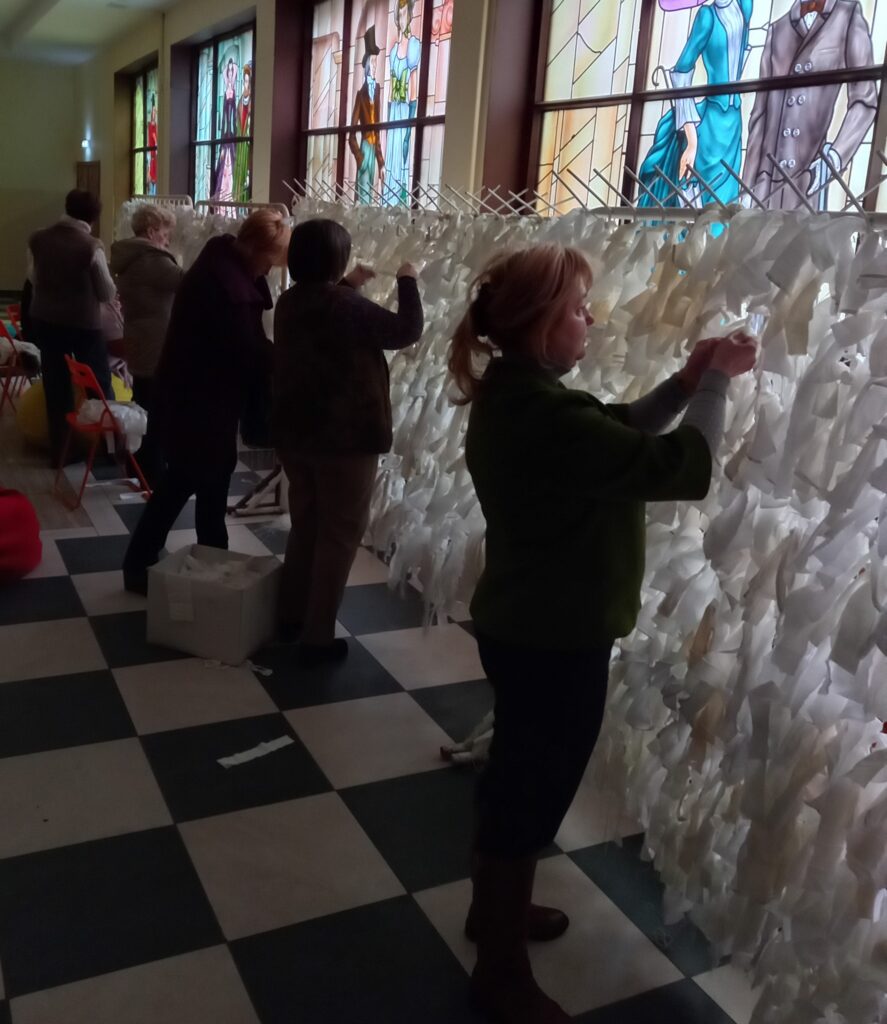 Вплітаючи тканину в сітки,ми наближаємо нашу Перемогу.Маскувальна сітка для наших захисників – як оберіг від жінок України,що в тилу прагнуть допомогти армії та зробити свій внесок в нашу Перемогу.